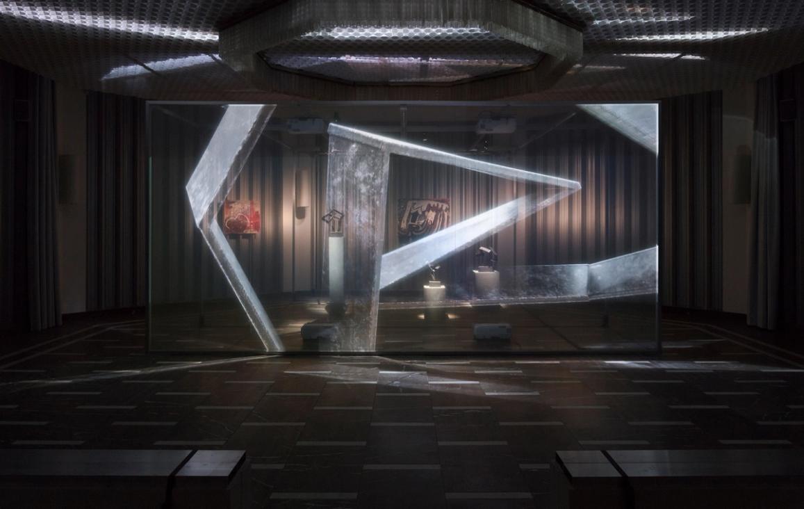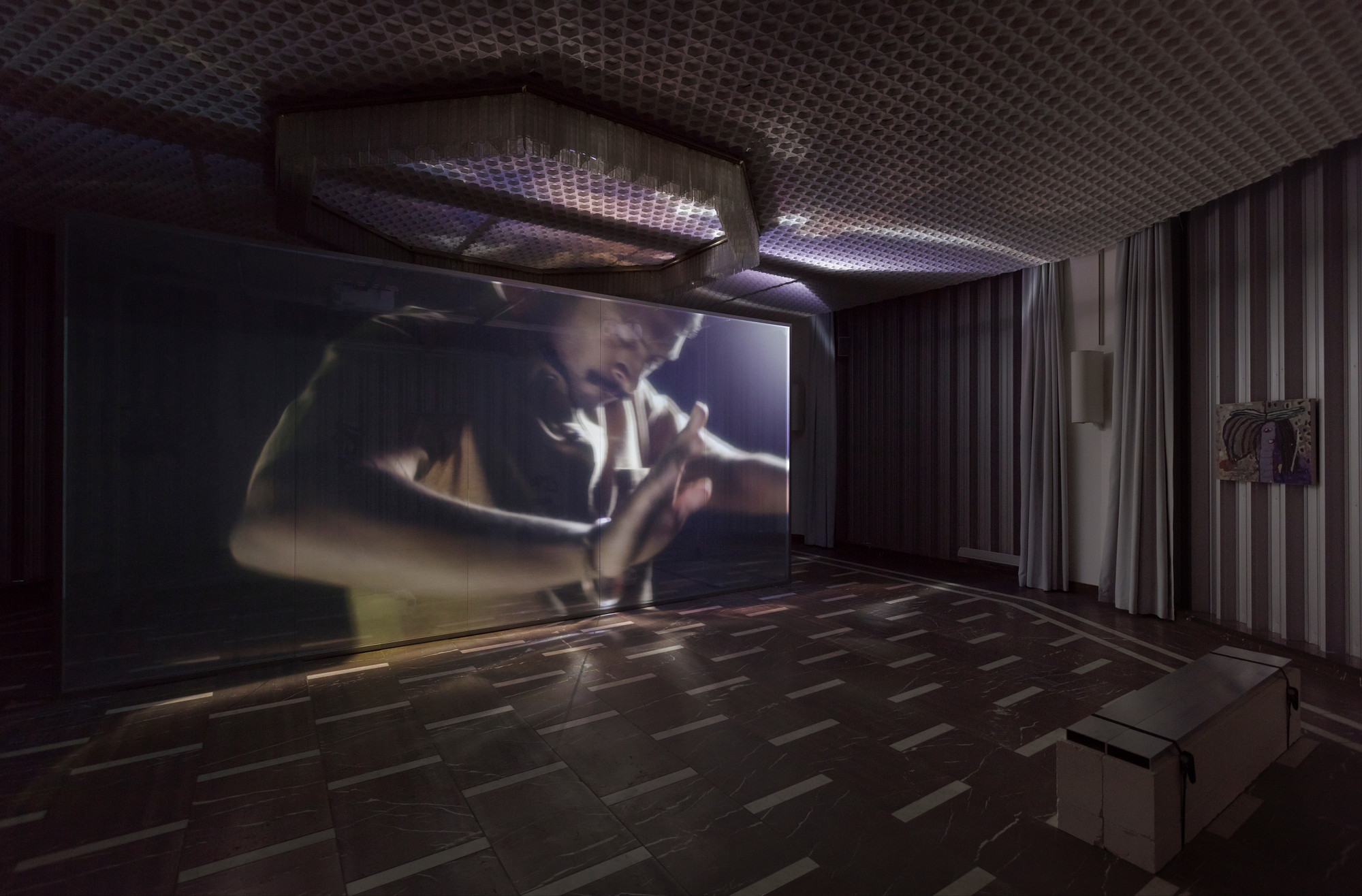 High-definition video (color, sound; 24 min.) projected on glass, with three paintings and three sculptures