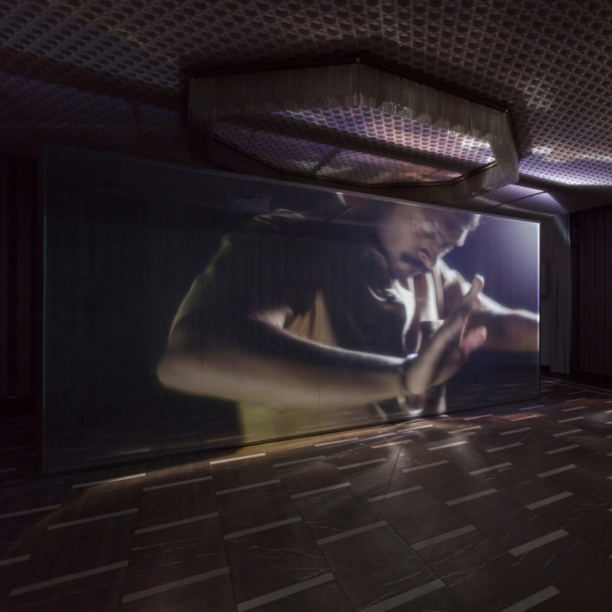 High-definition video (color, sound; 24 min.) projected on glass, with three paintings and three sculptures